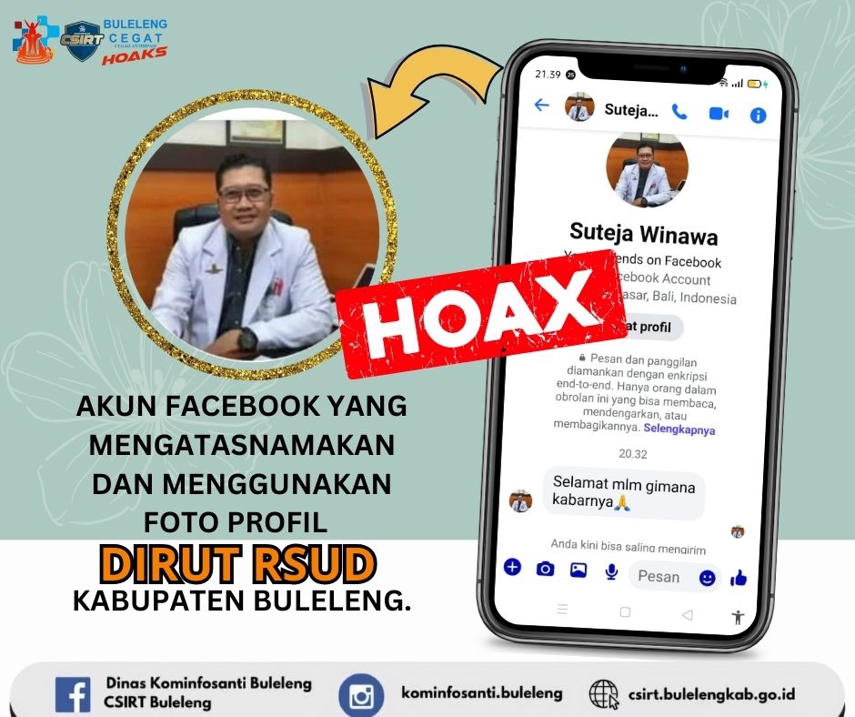 Beredar akun facebook yang mengatasnamakan dan menggunakan foto profil Dirut RSUD Kabupaten Buleleng, Bapak dr KETUT SUTEJA WIBAWA, Sp.KK.M.Kes. Akun tersebut terlihat menggunakan foto profil dan nama Beliau. Faktanya, akun Facebook dengan nama akun "Suteja Winawa" merupakan akun palsu atau HOAKS dengan upaya untuk melakukan modus penipuan dan pencemaran nama baik dengan menyalahgunakan identitas beliau. Dengan adanya laporan tersebut Tim internal CSIRT Buleleng mengklarifikasi bahwa akun tersebut BUKAN akun resmi Dirut RSUD Kabupaten Buleleng. Kepada Sahabat Minfo, untuk senantiasa berhati-hati apabila menerima pesan atau Messenger dari akun serupa, untuk menghindari kegiatan yang melanggar hukum, seperti penipuan, pornografi, sara dan lain-lain. Untuk mengabaikan pesan tersebut, INGAT selalu lakukan KONFIRMASI lebih dulu kepada kami. Terima Kasih.