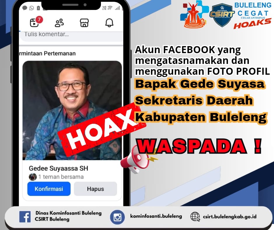Beredar akun facebook yang mengatasnamakan dan menggunakan foto profil Sekretaris Daerah Kabupaten Buleleng, Bapak Drs. Gede Suyasa, M.Pd. Akun tersebut terlihat menggunakan foto profil dan nama Beliau.Faktanya, akun Facebook dengan nama akun "Gedee Suyaassa SH" merupakan akun palsu atau HOAKS dengan upaya untuk melakukan modus penipuan dan pencemaran nama baik dengan menyalahgunakan identitas beliau. Dengan adanya laporan tersebut Tim internal CSIRT Buleleng mengklarifikasi bahwa akun tersebut BUKAN akun resmi Sekretaris Daerah Kabupaten Buleleng. Kepada Sahabat Minfo, untuk senantiasa berhati-hati apabila menerima pesan atau Messenger dari akun serupa, untuk menghindari kegiatan yang melanggar hukum, seperti penipuan, pornografi, sara dan lain-lain, untuk mengabaikan pesan tersebut, INGAT, selalu lakukan KONFIRMASI lebih dulu kepada kami. Terima Kasih.