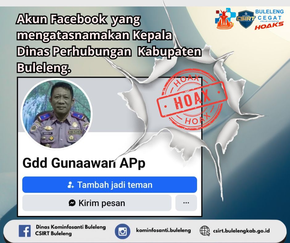 Beredar sebuah akun Facebook yang mengatasnamakan dan menggunakan foto Profil Kepala Dinas Perhubungan Buleleng, Bapak GEDE GUNAWAN ADNYANA PUTRA, SE. M.Si Faktanya, Sesuai hasil konfirmasi, laporan, serta postingan media sosial, bahwa akun Facebook dengan Nama Gdd Gunaawan APp tersebut BUKAN MILIK dari Bapak GEDE GUNAWAN ADNYANA PUTRA, SE. M.Si. selaku Kepala Dinas Perhubungan Kabupaten Buleleng. Kepada segenap sahabat Minfo, untuk senantiasa berhati-hati apabila menerima pesan dari akun serupa, untuk mengabaikan pesan tersebut, INGAT, selalu lakukan KONFIRMASI lebih dulu kepada kami. Terima Kasih.