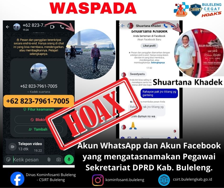 Beredar akun WhatsApp dan Akun Facebook yang mengatasnamakan dan menggunakan foto Profil Pegawai Sekretariat DPRD Kabupaten Buleleng, Bapak Kadek Suartana.Faktanya,Sesuai laporan langsung kepada Tim Internal CSIRT Buleleng bahwa akun WhatsApp dengan nomor +62 823-7961-7005 dan Akun Facebook dengan nama akun "Shuartana Khadek" merupakan AKUN PALSU atau HOAKS. Dengan adanya laporan tersebut dapat dipastikan nomor akun whatsapp dan akun facebook tersebut berupaya untuk melakukan MODUS PENIPUAN dan pencemaran nama baik atau kegiatan yang tidak bertanggung jawab dengan menyalahgunakan identitas Beliau.Kepada segenap sahabat Minfo, untuk senantiasa berhati-hati apabila menerima pesan atau panggilan dan di tambahkan pertemanan oleh akun tersebut mohon untuk diabaikan, lalu BLOKIR dan LAPORKAN akun tersebut. Untuk menghindari kegiatan yang melanggar hukum, seperti penipuan, pornografi, sara dan lain-lain. INGAT, selalu lakukan KONFIRMASI lebih dulu kepada kami atau kepada pihak Sekretariat DPRD Kabupaten Buleleng. Terima Kasih.