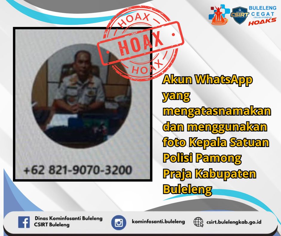 Beredar akun WhatsApp yang mengatasnamakan dan menggunakan foto Kepala Satuan Polisi Pamong Praja Kabupaten Buleleng , Bapak Gede Arya Suardana AP.MM. Akun tersebut terlihat menggunakan foto profil Beliau.Faktanya, Sesuai hasil konfirmasi dan klarifikasi, bahwa akun WhatsApp tersebut merupakan akun palsu atau HOAKS dengan upaya melakukan modus penipuan dan pencemaran nama baik dengan menyalahgunakan identitas Kasat Pol PP Kabupaten Buleleng, dan kepada segenap sahabat Minfo, untuk senantiasa berhati-hati apabila menerima pesan atau panggilan dari nomor serupa, untuk mengabaikan pesan atau panggilan tersebut, INGAT, selalu lakukan KONFIRMASI lebih dulu. Bisa kepada kami.Terima Kasih.