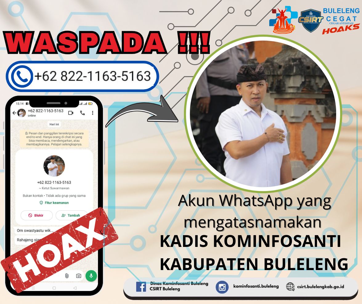 Beredar akun WhatsApp yang mengatasnamakan Kepala Dinas Komunikasi, Informatika, Persandian dan Statistik Kabupaten Buleleng, Bapak Ketut Suwarmawan, SSTP.,MM. Dan Akun tersebut terlihat menggunakan foto profil Beliau.Faktanya, sesuai hasil konfirmasi dan klarifikasi kami, bahwa akun WhatsApp tersebut merupakan AKUN PALSU atau HOAKS dengan upaya melakukan MODUS PENIPUAN dan pencemaran nama baik dengan menyalahgunakan identitas Kadis Kominfosanti Kabupaten Buleleng, dan kepada segenap sahabat Minfo, untuk senantiasa berhati-hati apabila menerima pesan atau panggilan dari nomor serupa, untuk mengabaikan pesan atau panggilan tersebut, INGAT, selalu lakukan KONFIRMASI lebih dulu. Bisa kepada kami. Terima Kasih.