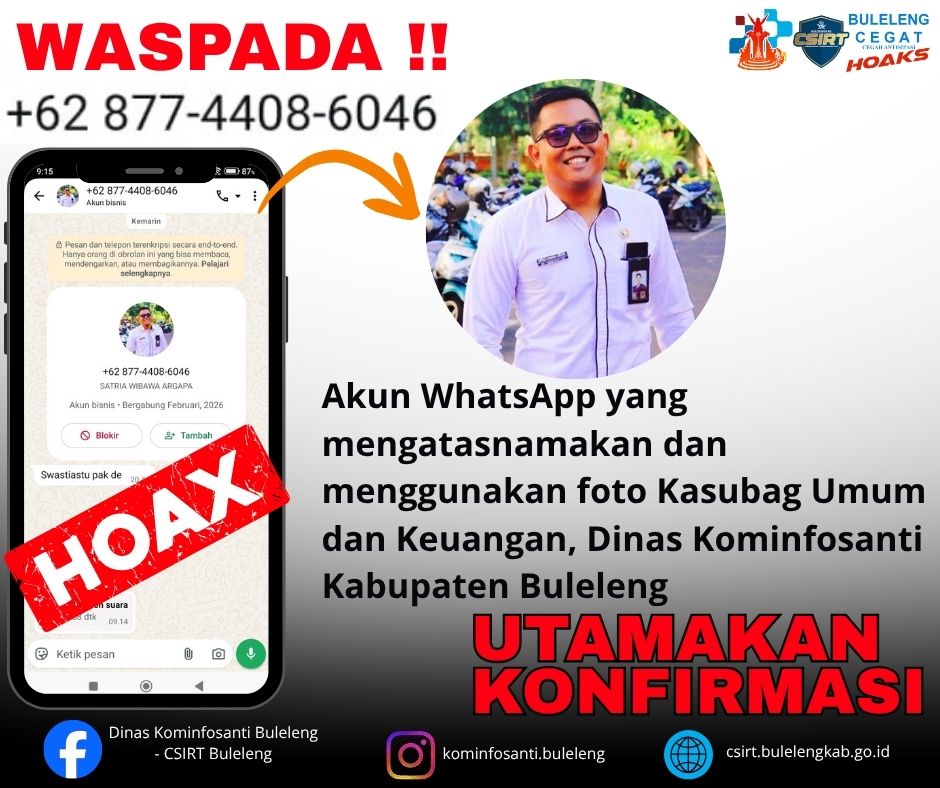Beredar Akun WhatsApp yang mengatasnamakan dan menggunakan foto Kepala Subbagian Umum dan Keuangan, Dinas Komunikasi, Informatika, Persandian dan Statistik Kabupaten Buleleng, Bapak Gede Hari Satria Wibawa Argapa, S.Pd., M.A.P.Faktanya,Sesuai laporan yang kami terima bahwa akun WhatsApp tersebut merupakan AKUN PALSU atau HOAKS dan BUKAN akun whatsapp resmi dari Bapak Gede Hari Satria Wibawa Argapa, S.Pd., M.A.P. Dan akun tersebut terlihat sudah melakukan Video Call Via WhatsApp, dan dapat dipastikan akun tersebut berupaya untuk melakukan MODUS PENIPUAN dan pencemaran nama baik atau kegiatan yang tidak bertanggung jawab dengan menyalahgunakan identitas Beliau, dan akun tersebut hanya memanfaatkan atau MENCATUT FOTO yang ada atau beredar di media sosial. Selanjutnya jika di chat atau bertukar pesan dengan akun tersebut, bisa di screenshoot kemudian laporkan pada kami dan abaikan pesan tersebut. Modus yang selama ini banyak dilakukan untuk menchat orang terdekat, bawahan atau masyarakat dan melakukan aksi penipuannya dengan membangun komunikasi terlebih dahulu.Kepada segenap sahabat Minfo, untuk senantiasa berhati-hati apabila menerima pesan atau panggilan dari nomor serupa untuk diabaikan, lalu BLOKIR dan LAPORKAN akun tersebut. INGAT, selalu lakukan KONFIRMASI lebih dulu bisa kepada Tim Internal CSIRT Buleleng. Terima Kasih.