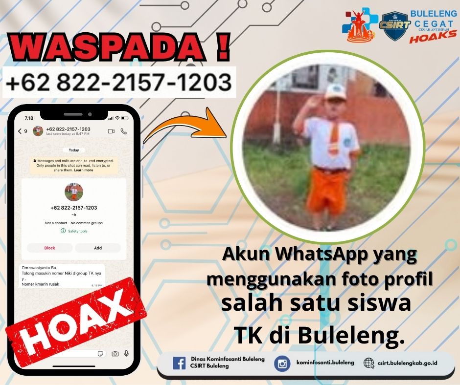 Beredar akun WhatsApp yang mengatasnamakan dan menggunakan foto profil salah satu siswa TK di Buleleng.Faktanya, sesuai laporan langsung bahwa akun WhatsApp tersebut merupakan AKUN PALSU atau HOAKS. Dengan adanya laporan tersebut dapat dipastikan nomor akun whatsapp tersebut berupaya untuk melakukan MODUS PENIPUAN dan pencemaran nama baik dengan menyalahgunakan identitas yang bersangkutan. Selanjutnya jika di chat atau bertukar pesan dengan nomor tersebut, bisa di screenshoot kemudian laporkan pada kami dan abaikan pesan tersebut.Modus ini tergolong baru, dengan menggunakan foto anak untuk dijadikan seolah-olah akunnya bisa dipercaya. Kepada segenap sahabat Minfo, untuk senantiasa berhati-hati apabila menerima pesan atau panggilan dari nomor serupa untuk diabaikan, lalu BLOKIR dan LAPORKAN akun tersebut. INGAT, selalu lakukan KONFIRMASI lebih dulu. Bisa kepada kami.Terima Kasih.