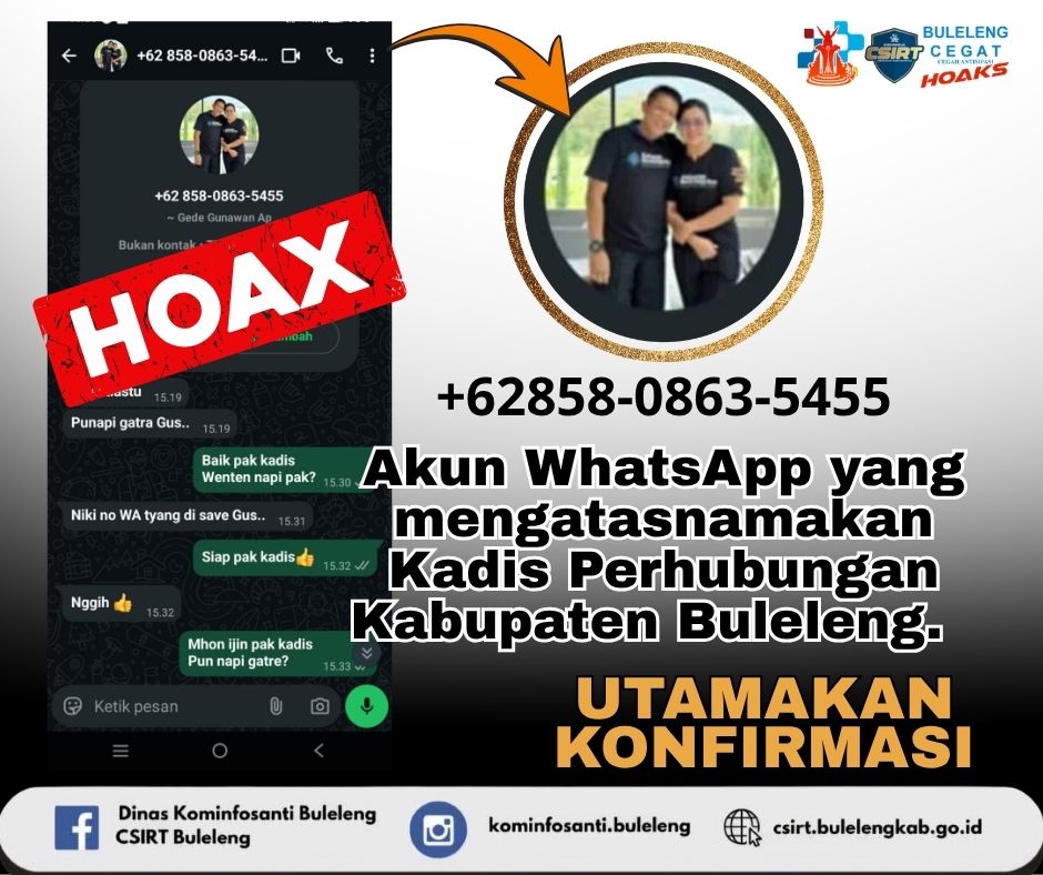Beredar Akun WhatsApp yang mengatasnamakan dan menggunakan foto profil Kepala Dinas Perhubungan Kabupaten Buleleng Bapak Gede Gunawan Adnyana Putra, S.E, M.Si. Faktanya, Sesuai laporan yang kami terima bahwa akun WhatsApp tersebut merupakan AKUN PALSU atau HOAKS dan BUKAN akun whatsapp resmi dari Bapak Gede Gunawan Adnyana Putra, S.E, M.Si. Dan dapat dipastikan akun tersebut berupaya untuk melakukan MODUS PENIPUAN dan pencemaran nama baik atau kegiatan yang tidak bertanggung jawab dengan menyalahgunakan identitas Beliau, selain itu akun tersebut hanya memanfaatkan atau MENCATUT FOTO yang ada atau beredar di media sosial. Selanjutnya jika di chat atau bertukar pesan dengan akun tersebut, bisa di screenshoot kemudian laporkan pada kami dan abaikan pesan tersebut. Modus yang selama ini banyak dilakukan untuk menchat orang terdekat, bawahan atau masyarakat dan melakukan aksi penipuannya dengan membangun komunikasi terlebih dahulu. Kepada segenap sahabat Minfo, untuk senantiasa berhati-hati apabila menerima pesan atau panggilan dari nomor serupa untuk diabaikan, lalu BLOKIR dan LAPORKAN akun tersebut. INGAT, selalu lakukan KONFIRMASI lebih dulu. Terima Kasih.