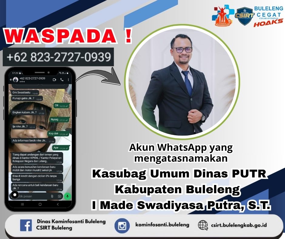 Beredar akun WhatsApp yang mengatasnamakan dan menggunakan foto profil Kasubag Umum Dinas Pekerjaan Umum dan Tata Ruang Kabupaten Buleleng, Bapak I Made Swadiyasa Putra, S.T.Faktanya, sesuai hasil konfirmasi dan klarifikasi kami, bahwa akun WhatsApp tersebut merupakan AKUN PALSU dan BUKAN AKUN whatsapp resmi dari Bapak I Made Swadiyasa Putra, S.T. Dengan upaya melakukan MODUS PENIPUAN dan pencemaran nama baik dengan menyalahgunakan identitas Beliau, dan Akun tersebut hanya memanfaatkan atau MENCATUT FOTO yang ada atau beredar di media sosial. Selanjutnya jika di chat atau bertukar pesan dengan akun tersebut, bisa di screenshoot kemudian laporkan pada kami dan abaikan pesan tersebut. Modus yang selama ini banyak dilakukan untuk menchat orang terdekat, bawahan atau masyarakat dan melakukan aksi penipuannya dengan membangun komunikasi terlebih dahulu dan menawarkan lelang kendaraan murah.Untuk lelang kendaraan TIDAK melalui akun WhatsApp pribadi, dan selalu dimuat di media elektronik resmi, seperti website.Kepada segenap sahabat Minfo, untuk senantiasa berhati-hati apabila menerima pesan atau panggilan dari nomor serupa untuk diabaikan, lalu BLOKIR dan LAPORKAN akun tersebut. INGAT, selalu lakukan KONFIRMASI lebih dulu. Bisa kepada kami. Terima Kasih.
