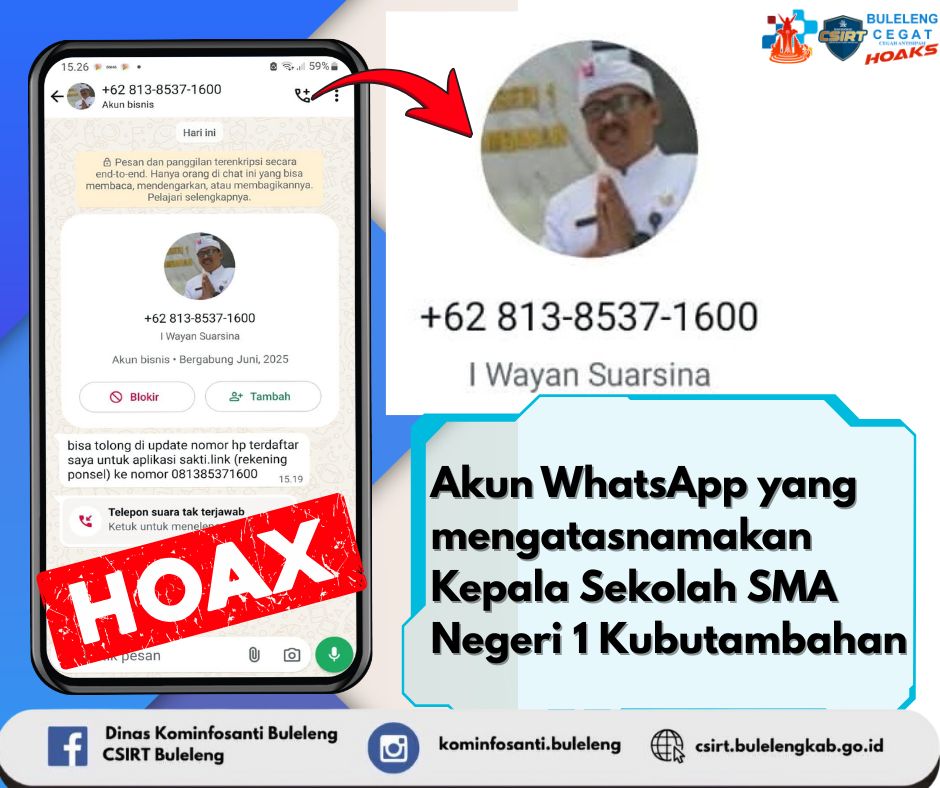 Beredar sebuah akun WhatsApp yang mengatasnamakan dan menggunakan foto Profil Kepala Sekolah SMA Negeri 1 Kubutambahan, Bapak I Wayan Suarsina, S.Pd., M.Pd.Faktanya : Sesuai hasil konfirmasi dan laporan bahwa nomor akun WhatsApp tersebut BUKAN MILIK Bapak I Wayan Suarsina, S.Pd., M.Pd.Kepada segenap sahabat Minfo, untuk senantiasa berhati-hati apabila menerima pesan dari akun serupa, untuk mengabaikan pesan tersebut, INGAT, selalu lakukan KONFIRMASI lebih dulu kepada kami.