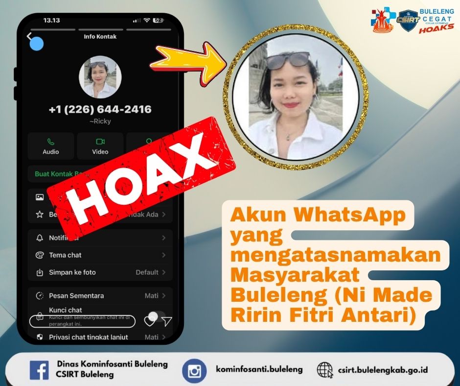 Beredar akun WhatsApp yang mengatasnamakan dan menggunakan foto profil mayarakat Buleleng, atas nama Ibu (Ni Made Ririn Fitri Antari) Faktanya, sesuai hasil konfirmasi dan klarifikasi kami, bahwa akun WhatsApp tersebut merupakan AKUN PALSU dan BUKAN AKUN whatsapp resmi dari Ibu (Ni Made Ririn Fitri Antari) Dengan upaya melakukan MODUS PENIPUAN dan pencemaran nama baik dengan menyalahgunakan identitas Beliau, dan Akun tersebut hanya memanfaatkan atau MENCATUT FOTO yang ada atau beredar di media sosial. Selanjutnya jika di chat atau bertukar pesan dengan akun tersebut, bisa di screenshoot kemudian laporkan pada kami dan abaikan pesan tersebut. Modus yang selama ini banyak dilakukan untuk menchat orang terdekat, bawahan atau masyarakat dan melakukan aksi penipuannya dengan membangun komunikasi terlebih dahulu.Kepada segenap sahabat Minfo, untuk senantiasa berhati-hati apabila menerima pesan atau panggilan dari nomor serupa untuk diabaikan, lalu BLOKIR dan LAPORKAN akun tersebut. INGAT, selalu lakukan KONFIRMASI lebih dulu. Bisa kepada kami. Terima Kasih.