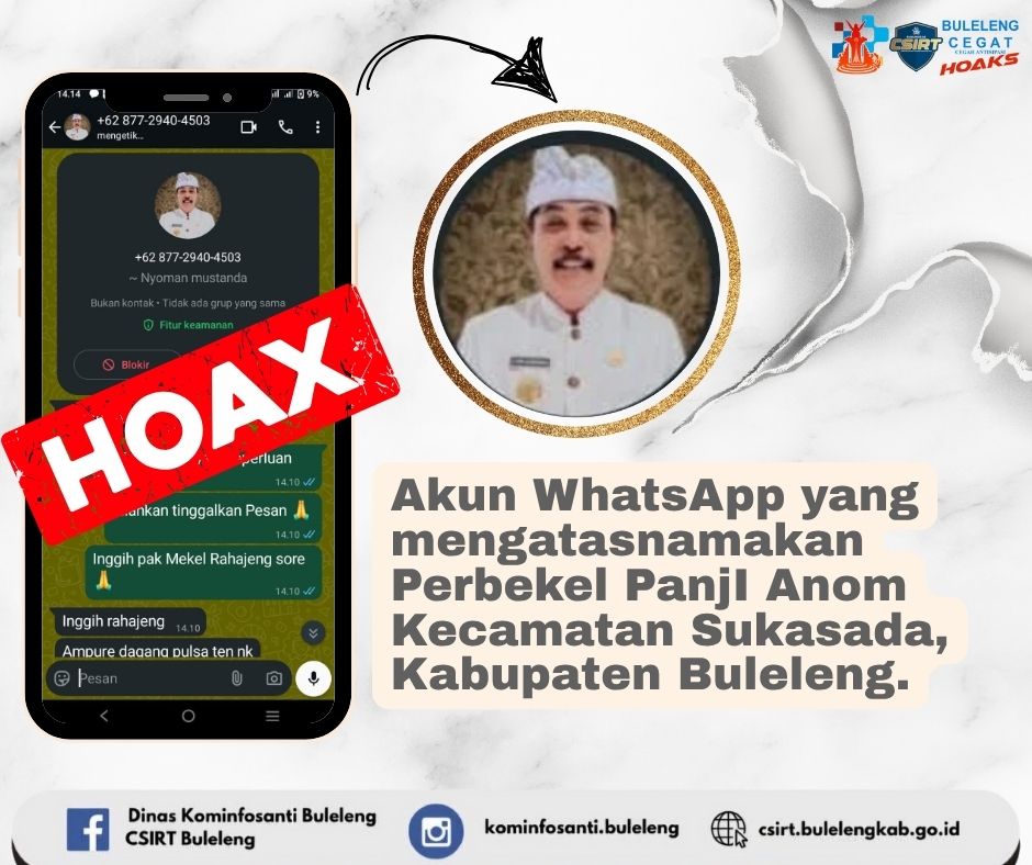 Beredar akun WhatsApp yang mengatasnamakan dan menggunakan foto profil Bapak I Nyoman Mustanda selaku Perbekel (Kepala Desa) Panji Anom di Kecamatan Sukasada, Kabupaten Buleleng. Faktanya, sesuai hasil konfirmasi dan klarifikasi kami, bahwa akun WhatsApp tersebut merupakan AKUN PALSU dan BUKAN AKUN whatsapp resmi dari Bapak Bapak I Nyoman Mustanda. Dengan upaya melakukan MODUS PENIPUAN dan pencemaran nama baik dengan menyalahgunakan identitas Beliau, dan Akun tersebut hanya memanfaatkan atau MENCATUT FOTO yang ada atau beredar di media sosial. Selanjutnya jika di chat atau bertukar pesan dengan akun tersebut, bisa di screenshoot kemudian laporkan pada kami dan abaikan pesan tersebut. Modus yang selama ini banyak dilakukan untuk menchat orang terdekat, bawahan atau masyarakat dan melakukan aksi penipuannya dengan membangun komunikasi terlebih dahulu. Kepada segenap sahabat Minfo, untuk senantiasa berhati-hati apabila menerima pesan atau panggilan dari nomor serupa untuk diabaikan, lalu BLOKIR dan LAPORKAN akun tersebut. INGAT, selalu lakukan KONFIRMASI lebih dulu. Bisa kepada kami. Terima Kasih.