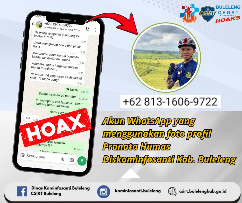Beredar sebuah akun WhatsApp yang menggunakan foto Profil Pranata Humas Dinas Kominfosanti, Informatika, Persandian dan Statistik Kabupaten Buleleng, Bapak Ketut Widiasa, S.E., M.A.P. Dari laporan yang kami terima akun WhatsApp tersebut telah mengirim pesan/ chat kebeberapa nomor dengan menawarkan harga kendaraan murah.Faktanya : Sesuai hasil konfirmasi dan laporan bahwa nomor akun WhatsApp tersebut BUKAN MILIK Bapak Ketut Widiasa, S.E., M.A.P.Kepada segenap sahabat Minfo, untuk senantiasa berhati-hati apabila menerima pesan dari akun serupa, untuk mengabaikan pesan tersebut, INGAT, selalu lakukan konfirmasi lebih dulu kepada kami.