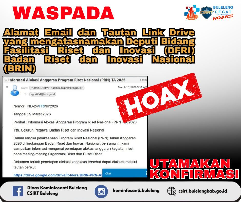 Alamat Email dan Tautan Link Drive yang mengatasnamakan Deputi Bidang Fasilitasi Riset dan Inovasi (DFRI) Badan Riset dan Inovasi Nasional (BRIN) , tentang Informasi Alokasi Anggaran Program Riset Nasional (PRN) TA 2026.Faktanya,Sesuai konfirmasi langsung dari Kepala Badan Riset dan Inovasi Daerah Kabupaten Buleleng bahwa tautan Link Drive tersebut TIDAK BENAR atau RESMI dan bukan dikirim oleh pihak Deputi Bidang Fasilitasi Riset dan Inovasi (DFRI), serta tautan Link Drive tersebut berpotensi Spam. Kepada segenap sahabat Minfo tetap berhati-hati bila mendapatkan hal yang serupa jangan klik tautan link sembarangan dan mencurigakan atau tidak jelas sumbernya utamakan untuk KONFIRMASI. Terima kasih.