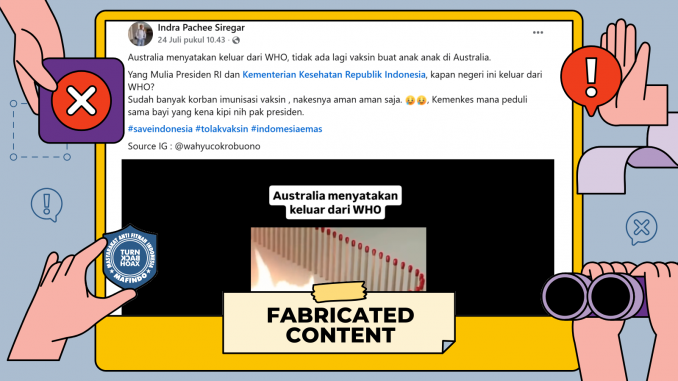 Akun Instagram “wahyucokrobuono” pada Senin (21/7/2024) membagikan video yang disertai narasi: “Setelah Australia keluar dari WHO Italia menyusul keluar dari WHO”Video serupa juga dibagikan ulang oleh akun Facebook “Indra Pachee Siregar” [arsip] pada Kamis (24/7/2025) disertai narasi:“Australia menyatakan keluar dari WHO, tidak ada lagi vaksin buat anak anak di Australia. Yang Mulia Presiden RI dan Kementerian Kesehatan Republik Indonesia, kapan negeri ini keluar dari WHO? Sudah banyak korban imunisasi vaksin , nakesnya aman aman saja. ????????, Kemenkes mana peduli sama bayi yang kena kipi nih pak presiden. #saveindonesia #tolakvaksin #indomesiaemas Source IG : @wahyucokrobuono”Disadur dari artikel Periksa Fakta tirto.id.Tim Riset Tirto melakukan penelusuran dengan memasukan kata kunci “Australia resmi keluar dari WHO” ke mesin pencarian Google. Tidak ada pernyataan resmi dari pemerintah Australia ataupun sumber kredibel yang membenarkan klaim.Video yang beredar menampilkan Malcolm Roberts—senator dari Partai One Nation, partai sayap kanan Australia—yang dikenal vokal menyuarakan narasi anti-imigran dan anti-WHO. Video itu diambil dari kanal YouTube resmi Malcolm Roberts dan merupakan bagian dari kampanye politik One Nation. Dalam video tersebut, Roberts menyarankan agar Australia keluar dari WHO, PBB, dan WEF karena dianggap boros anggaran. Namun, tidak ada pernyataan Australia sudah keluar secara resmi dari organisasi-organisasi tersebut. WHO juga masih mencantumkan Australia dan Italia sebagai anggota aktif di laman resminya.