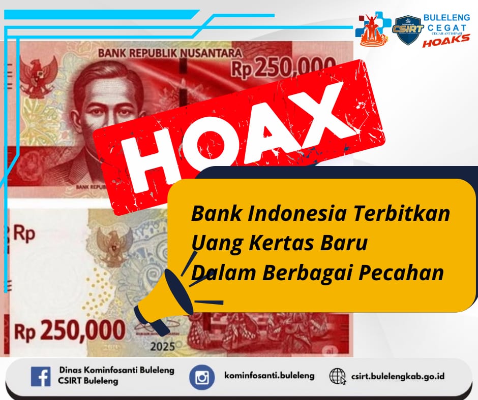 Beredar sebuah postingan di media sosial Facebook yang mengeklaim Bank Indonesia (BI) dikabarkan telah menerbitkan uang kertas baru berbagai pecahan. Kabar ini muncul dalam sejumlah unggahan pada Agustus 2025.Faktanya, penerbitan uang kertas baru pecahan Rp80, Rp3.500, Rp17.500, Rp22.000, Rp22.500, Rp40.000, hingga Rp250.000 merupakan hoaks. Dilansir dari kompas.com, BI terakhir kali meluncurkan uang kertas baru pada 18 Agustus 2022. Terdapat tujuh pecahan uang kertas Rupiah Tahun Emisi 2022. Nominalnya meliputi pecahan Rp1.000, Rp2.000, Rp5.000, Rp10.000, Rp20.000, Rp50.000, dan Rp100.000. Berdasarkan informasi di situs resmi bi.go.id, tidak ada uang kertas dengan pecahan Rp80, Rp3.500, Rp17.500, Rp22.000, Rp22.500, Rp40.000, bahkan Rp250.000. POH Kepala Biro Strategic Corporate Branding & TJSL Perusahaan Umum Percetakan Uang Republik Indonesia (Peruri), Yahdi Lil Ihsan memastikan tidak ada pecahan tersebut.