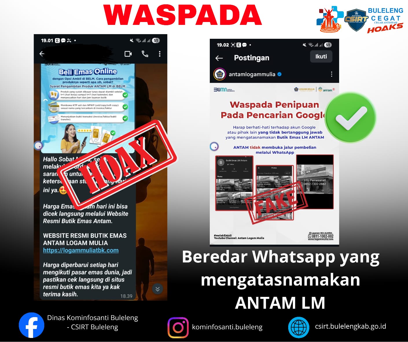 Beredar di grup whatsapp beli emas online yang mengatasnamakan Butik Emas Antam Logam Mulia.Faktanya,Dari hasil penelusuran Tim Internal CSIRT Buleleng dapat dipastikan ini adalah upaya untuk melakukan PENIPUAN dengan modus beli emas antam secara online yang sedang marak terjadi melalui grup whatsapp, biasanya pelaku mengaku sebagai distributor atau reseller resmi Butik Emas Antam Mulia dan menawarkan harga jauh lebih murah dari pasaran dan mencantumkan link website dan foto emas agar terlihat meyakinkan, dan pastikan membeli emas hanya melalui toko resmi, butik resmi Antam, atau platform terpercaya. Dan selalu cek keaslian serta legalitas penjual sebelum melakukan transaksi.Kepada sahabat Minfo tetap waspada dan selalu berhati-hati jika mendapatkan kiriman yang serupa agar diabaikan.