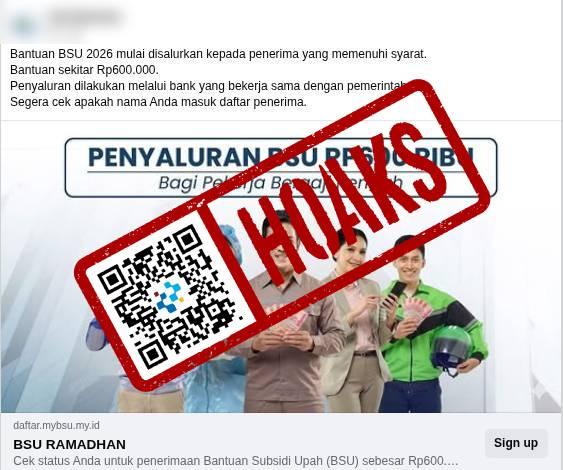 Beredar sebuah unggahan di media sosial Facebook yang mengeklaim bahwa Bantuan Subsidi Upah (BSU) senilai Rp600.000 mulai disalurkan pada Maret 2026.Faktanya, klaim tersebut adalah tidak benar. Dilansir dari kompas.com, Kepala Biro Humas Kementerian Ketenagakerjaan (Kemnaker) Faried Abdurrahman Nur Yuliono menegaskan bahwa belum ada kebijakan terkait penyaluran BSU pada 2026. Jika kedepannya terdapat kebijakan baru, Kemnaker akan menyampaikannya secara terbuka melalui kanal resmi kemnaker.go.id. Adapun, tautan yang diklaim untuk cek pencairan BSU Maret 2026 mengarah ke sebuah laman yang meminta pengunjung memasukkan nama lengkap dan nomor Telegram aktif. Oleh karena itu, masyarakat diimbau untuk waspada terhadap informasi palsu mengatasnamakan BSU 2026, terutama yang memuat tautan pendaftaran yang tidak resmi dan berpotensi penipuan.