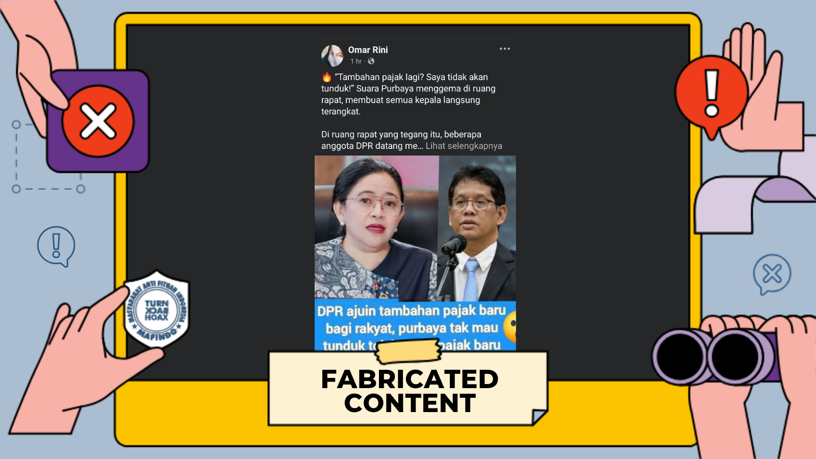 Beredar unggahan foto dari akun Facebook “Omar Rini” pada Minggu (30/11/2025) berisi narasi: “DPR ajuin tambahan pajak baru bagi rakyat, purbaya tak mau tunduk tolak tegas pajak baru”.Hingga Senin (1/12/2025) unggahan tersebut mendapat sekitar 9.800-an tanda suka, 4.100-an komentar, serta dibagikan ulang lebih dari 380 kali.Tim Pemeriksa Fakta Mafindo (TurnBackHoax) memasukkan kata kunci “dpr ajukan tambahan pajak baru bagi rakyat” ke mesin pencarian Google. Hasilnya, tidak ditemukan informasi valid atau pemberitaan dari media kredibel yang membenarkan klaim.TurnBackHoax lalu memeriksa foto Ketua DPR RI Puan Maharani yang disertakan dalam unggahan menggunakan Google Lens. Hasil penelusuran mengarah ke unggahan foto di akun Instagram pribadi Puan Maharani “puanmaharaniri”, foto tersebut identik dengan unggahan akun Facebook “Omar Rini”.Diketahui, konteks asli foto adalah momen Puan Maharani (saat itu merupakan Ketua ASEAN Inter-Parliamentary Assembly) menyampaikan pesan parlemen ASEAN dalam KTT ASEAN ke-42 di Labuan Bajo, NTT, pada Mei 2023.TurnBackHoax kemudian memasukkan kata kunci “pesan parlemen asean dalam ktt asean ke-42” ke mesin pencarian Google. Hasil penelusuran mengarah ke pemberitaan detik.com “Puan Bawa Pesan AIPA di KTT ASEAN, Singgung Ekonomi Hijau dan Perdamaian.Berdasarkan berita yang tayang Rabu (10/5/2023) itu, diketahui jika Puan Maharani membahas tentang ekonomi hijau dan perdamaian. Tidak ditemukan pernyataan tentang DPR yang mengajukan tambahan pajak bagi rakyat.