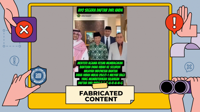 Beredar video dari akun tiktok “dana.hiba18” pada Selasa (30/09/2025) disertai takarir:“Menteri Agama resmi membagikan bantuan dana hibah ke seluruh wilayah indonesia bantuan dana hibah mulai 250 jt-1 milyar bagi yang membutuhkan silahkan daftar diri anda sekarang”Hingga Senin (06/10/2025), konten tersebut telah mendapat lebih dari 5 ribu tanda suka, menuai lebih dari 5 ribu interaksi komentar serta dibagikan ulang lebih dari 3 ribu kali oleh pengguna Tiktok lainnya.Tim Pemeriksa Fakta Mafindo (TurnBackHoax) menelusuri kebenaran klaim dengan memasukkan kata kunci “Menteri Agama Resmi Membagikan Dana Hibah 250 Juta-1 Miliar” ke mesin pencarian Google. Hasilnya tidak ditemukan informasi kredibel yang membenarkan klaim.Selanjutnya Tim Pemeriksa Fakta Mafindo (TurnBackHoax) menelusuri situs resmi kementerian agama kemenag.go.id. Hasilnya tidak ditemukan informasi terkait dana hibah 250 juta-1 miliar untuk seluruh wilayah di Indonesia.Tim Pemeriksa Fakta Mafindo (TurnBackHoax) kemudian menelusuri lebih dalam terkait unggahan dengan memasukan potongan tangkapan layar ke dalam Google Lens. Hasilnya ditemukan video serupa dengan klaim dari akun tiktok kemenag_ri yang menjelaskan bahwa video tersebut merupakan pertemuan Menteri Agama Nasaruddin Umar dengan Duta Besar Arab Saudi, Faisal bin Abdullah Al-Amudi, di Menteng, Jakarta. Keduanya mendiskusikan penguatan kerja sama dua negara, dari haji hingga pendidikan.