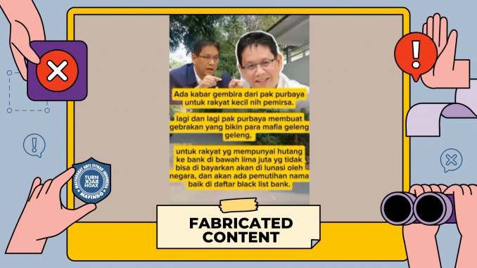 Pada Selasa (16/10/2025) akun Facebook “Dhia Al Maududi” membagikan video disertai narasi:Ada kabar gembira dari pak purbaya untuk rakyat kecil nih pemirsa.lagi dan lagi pak purbaya membuat gebrakan yang bikin para mafia geleng geleng,untuk rakyat yg mempunyai hutang ke bank di bawah lima juta yg tidak bisa di bayarkan akan di lunasi oleh negara, dan akan ada pemutihan nama baik di daftar black list bank.Tim Pemeriksa Fakta Mafindo (TurnBackHoax) mencari informasi tentang “negara lunasi hutang bank di bawah 5 juta” melalui pencarian Google. Namun tidak ditemukan pengumuman resmi yang membenarkan klaim.TurnBackHoax menemukan artikel di suarameredeka.com berjudul “1 Juta Pelaku UMKM Akan Dihapus Hutangnya oleh Pemerintah, Totalnya Capai Rp 14 Triliun” yang diunggah pada Januari 2025.Dalam artikel tersebut dijelaskan bahwa pemerintah melalui Kementerian Usaha Mikro, Kecil, dan Menengah menyiapkan program penghapusan utang bagi sekitar satu juta pelaku UMKM dengan nilai total sekitar Rp 14 triliun.Program ini dilaksanakan berdasarkan Peraturan Pemerintah Nomor 47 Tahun 2024 tentang Penghapusan Piutang Macet bagi UMKM.