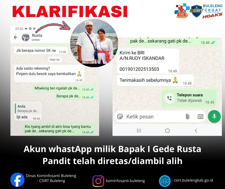 Beredar nomor akun WhatsApp milik Bapak I Gede Rusta Pandit sudah diambil alih atau diretas oleh orang atau oknum yang tidak bertanggung jawab.Faktanya,Sesuai laporan langsung kepada Tim Internal CSIRT Buleleng bahwa Nomor Akun WhatsApp milik Bapak I Gede Rusta Pandit dengan Nomor +62 813-3851-4821 sudah diambil alih atau diretas oleh orang atau oknum yang tidak bertanggung jawab. Dari laporan yang kami terima bahwa akun whatsapp tersebut telah digunakan untuk mengirim pesan/ chat untuk meminta transfer sejumlah uang. Dengan adanya laporan tersebut dapat dipastikan nomor akun whatsapp tersebut berupaya untuk melakukan MODUS PENIPUAN dan pencemaran nama baik dengan menyalahgunakan identitas Beliau.Kepada segenap sahabat Minfo, untuk senantiasa berhati-hati apabila menerima pesan atau panggilan dari nomor serupa agar diabaikan, karena saat ini akun whatsapp tersebut masih diambil alih atau sedang berpindah tangan. INGAT, selalu lakukan KONFIRMASI lebih dulu kepada kami.Terima Kasih.