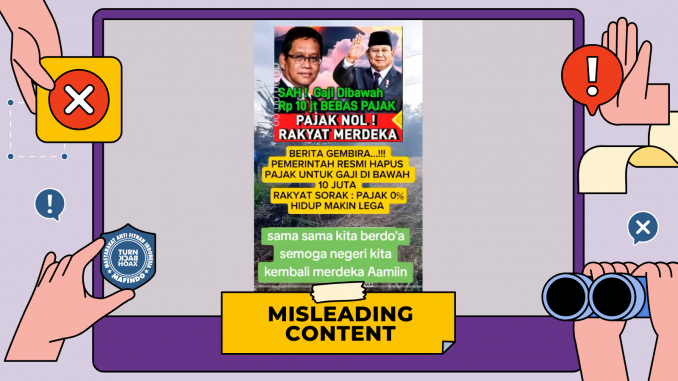Beredar video dari akun tiktok “muhasasabah” pada Senin (06/10/2025) disertai takarir: “Sah Gaji dibawah Rp. 10 Jt bebas pajakpajak nol! rakyat merdekaBerita gembira..!!Pemerintah resmi hapus pajak untuk gaji di bawah 10 jutarakyat sora: pajak 0% hidup makin legaSama sama kita berdoa semooga negeri kita kembali merdeka Aamiin”Hingga Rabu (08/10/2025), konten tersebut telah mendapat lebih dari 1900 tanda suka, menuai lebih dari 200 komentar dan dibagikan ulang lebih dari 500 kali oleh pengguna Tiktok lainnya.Tim Pemeriksa Fakta Mafindo (TurnBackHoax) menelusuri kebenaran klaim dengan memasukkan kata kunci “pemerintah resmi hapus pajak untuk gaji di bawah 10 juta” ke mesin pencarian Google. Pencarian mengarah ke artikel suara.com berjudul “Kabar Gembira! Pemerintah Bebaskan Pajak Gaji di Bawah Rp10 Juta”. Artikel yang tayang Senin (15/09/2025) tersebut menjelaskan bahwa untuk menjaga daya beli masyarakat, pemerintah melakukan perluasan pembebasan Pajak Penghasilan (PPh) Pasal 21 yang ditanggung pemerintah (DTP).Artikel tersebut mengutip pernyataan Menteri Koordinator Bidang Perekonomian, Airlangga Hartarto yang mengatakan “Yang kemarin sudah diperlakukan untuk sektor padat karya, ini dilanjutkan ke sektor pariwisata, hotel, restoran, dan kafe”.Selanjutnya Tim Pemeriksa Fakta Mafindo (TurnBackHoax) melakukan penelusuran lebih lanjut terkait pembebasan pajak untuk gaji dibawah 10 juta, ditemukan artikel dari pajakku.com berjudul “Apakah Semua Pekerja dengan Gaji Hingga Rp10 Juta Bebas Pajak?” yang dimuat (22/9/2025). Artikel tersebut menjelaskan tidak semua yang memiliki gaji di bawah 10 juta mendapatkan pembebasan PPh 21, mengacu pada Peraturan Menteri Keuangan (PMK) no 10 Tahun 2025 hanya sektor padat karya (industri alas kaki, tekstil dan pakaian jadi, furnitur, kulit dan produk dari kulit) serta perluasan sektor yang baru yakni pariwisata. di luar sektor tersebut tidak mendapatkan insentif pembebasan PPh 21 DTP.