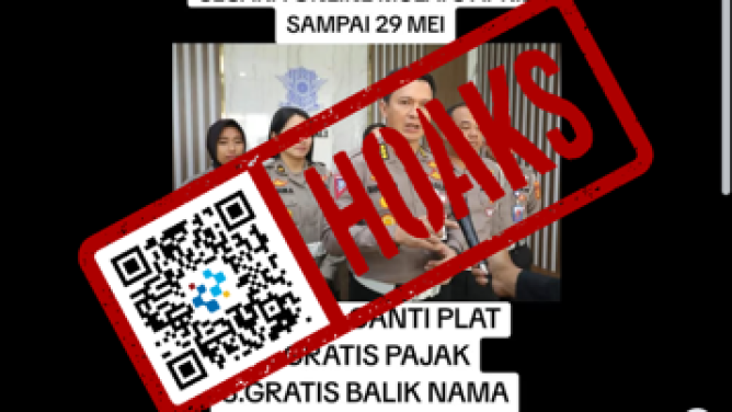 Beredar unggahan di media sosial Facebook yang mengeklaim bahwa ada program pemutihan pajak kendaraan bermotor, gratis ganti plat, dan gratis balik namaFaktanya, klaim tersebut adalah tidak benar. Dilansir dari kompas.com, mengutip dari laman resmi korlantas.polri.go.id, Korps Lalu Lintas (Korlantas) Polri memastikan bahwa informasi pemutihan pajak kendaraan bermotor pada 8 April-29 Mei 2026 adalah hoaks. Korlantas mengimbau masyarakat untuk tidak mudah percaya terhadap informasi yang beredar di media sosial tanpa sumber resmi. Masyarakat juga diminta untuk selalu mengecek kebenaran informasi melalui kanal resmi pemerintah atau instansi terkait, seperti Samsat dan Korlantas Polri.