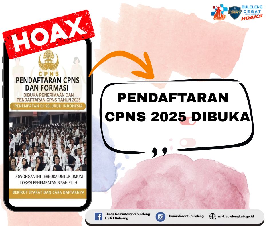 Akun Facebook “pendaftaran cpns” pada Senin (29/9/2025) mengunggah gambar yang berisi narasi :PENDAFTARAN CPNS DAN FORMASI DIBUKA PENERIMAAN DAN PENDAFTARAN CPNS TAHUN 2025. PENEMPATAN DI SELURUH INDONESIA LOWONGAN INI TERBUKA UNTUK UMUM LOKASI PENEMPATAN BISAH PILIHTim Pemeriksa Fakta Mafindo (TurnBackHoax) mengakses tautan dalam unggahan. Diketahui, tautan tidak mengarah ke laman resmi https://sscasn.bkn.go.id/. Tim Pemeriksa Fakta Mafindo (TurnBackHoax) mengakses tautan yang mengarah ke nomor Whatsapp, nomor mengarahkan untuk mengisi formulir yang meminta pengisian nama lengkap sesuai KTP dan nomor Telegram aktif. Ketika diteruskan, pelamar diminta untuk memasukkan kode verifikasi untuk masuk ke akun Telegram.Melansir dari kompas.com. BKN dan Kemenpan-RB sampai saat ini belum mengumumkan jadwal penerimaan CPNS 2025. Selain itu, tautan yang dicantumkan kemungkinan besar adalah modus phishing.