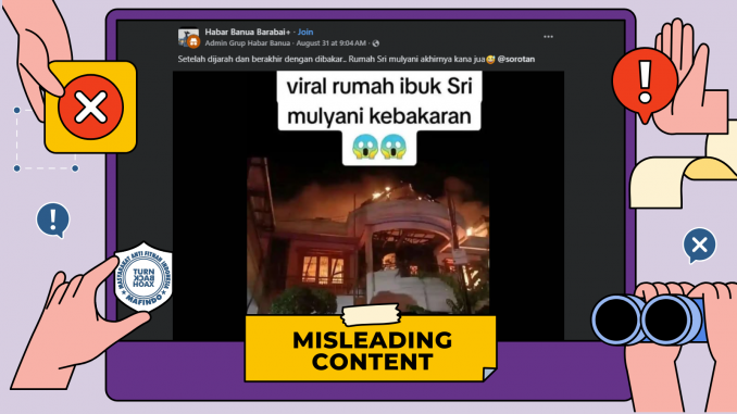 Pada Minggu (31/8/2025) grup Facebook “Habar Banua Barabai+” membagikan foto berisi narasi:“viral rumah ibuk Sri mulyani kebakaranSetelah dijarah dan berakhir dengan dibakar.. Rumah Sri mulyani akhirnya kana jua????”Hingga Selasa (9/9/2025) unggahan mendapatkan sekitar 34 tanda suka dan 4 komentar.Tim Pemeriksa Fakta Mafindo (TurnBackHoax) menelusuri tangkapan layar foto tersebut melalui Google Lens. Hasil penelusuran teratas mengarah ke pemberitaan tribunnews.com “Si Jago Merah Ngamuk Lalap Rumah Mewah di Buaran Regency, Kerugian Capai Rp 1,2 Miliar!”Dari berita yang tayang Selasa (11/4/2023) itu, diketahui kalau konteks asli foto yang disebarkan di grup Facebook “Habar Banua Barabai+” adalah dokumentasi kebakaran rumah dua lantai di Komplek Buaran Regency, Pondok Kelapa, Kecamatan Duren Sawit, Jakarta Timur. Insiden kebakaran terjadi pada Selasa malam, sekitar pukul 20.15 WIB, diduga karena korsleting listrik. TurnBackHoax kemudian melakukan pencarian dengan memasukkan kata kunci “Rumah Sri Mulyani dibakar massa” ke mesin pencarian Google. Hasilnya, tidak ditemukan pemberitaan dari media kredibel tentang terbakarnya rumah Sri Mulyani.