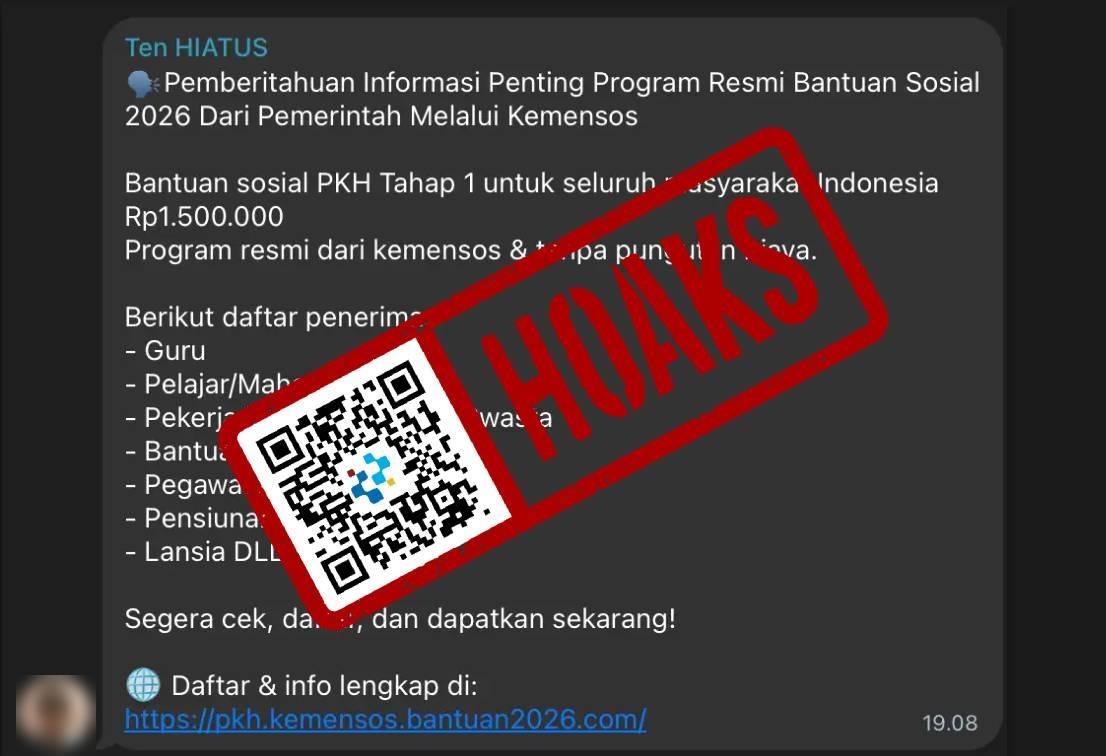 Beredar sebuah pesan berantai Telegram yang mengeklaim adanya tautan bantuan sosial Program Keluarga Harapan (PKH) tahap 1 dari Kementerian Sosial 2026.Faktanya, klaim tersebut adalah tidak benar. Dilansir dari turnbackhoax.id, Hasil pemeriksaan menunjukkan bahwa tautan tersebut tidak mengarah ke situs resmi pemerintah seperti kemensos.go.id atau cekbansos.kemensos.go.id, melainkan ke sebuah laman yang menampilkan formulir digital dan meminta pengunjung mengisi data pribadi, seperti nama lengkap serta nomor Telegram. Selain itu, dikutip dari laman resmi milik Kementerian Sosial Republik Indonesia (Kemensos) menyatakan bahwa pemerintah tidak pernah membuat situs atau tautan resmi untuk pendaftaran langsung bantuan sosial. Adapun penerima bantuan sosial adalah masyarakat yang sudah terdaftar dalam Data Terpadu Kesejahteraan Sosial (DTKS) atau Data Tunggal Sosial Ekonomi Nasional (DTSEN), jika masyarakat layak menerima namun belum terdaftar dalam DTKS, bisa diusulkan Pemerintah Daerah atau mengajukan melalui Aplikasi Cek Bansos di menu Usul-Sanggah. Masyarakat diimbau agar selalu mengecek ulang kebenaran berita dan tidak ikut menyebarkannya.