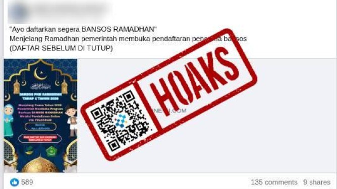Beredar sebuah unggahan di media sosial Facebook yang mengeklaim adanya tautan pendaftaran bantuan sosial (bansos) Ramadan 2026.Faktanya, klaim tersebut adalah tidak benar. Dilansir dari turnbackhoax.id, diketahui bahwa tautan pada unggahan tidak mengarah ke laman resmi pengecekan bansos Kementerian Sosial di cekbansos.kemensos.go.id. Sebaliknya, tautan tersebut mengarahkan ke sebuah laman yang meminta pengunjung untuk mengisi data pribadi. Informasi yang diminta meliputi nama lengkap sesuai KTP, nomor Telegram aktif, asal provinsi, dan jenis kelamin. Melansir dari kompas.com, menjelang Ramadan 1447 H yang diperkirakan berlangsung pada pertengahan Februari 2026, pemerintah menyalurkan bantuan sosial tahap pertama tahun 2026 melalui Program Keluarga Harapan (PKH) dan Bantuan Pangan Non-Tunai (BPNT). Penyaluran ini bertujuan untuk menjaga daya beli masyarakat rentan menjelang bulan puasa dan Idulfitri. Program bantuan rutin dari Kementerian Sosial tersebut diperuntukkan bagi keluarga miskin dan rentan, dengan kelompok prioritas meliputi ibu hamil, balita, lanjut usia, penyandang disabilitas, serta anak usia sekolah dari keluarga kurang mampu.