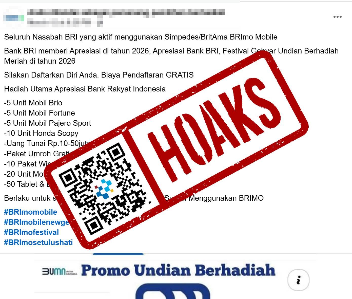 Beredar di sosial media Facebook unggahan berisi tautan yang diklaim untuk mendaftar Festival Gebyar Undian Berhadiah Meriah 2026. Dalam unggahan disebutkan bahwa program tersebut merupakan apresiasi dari Bank Rakyat Indonesia (BRI) dan dapat diikuti oleh seluruh nasabah BRI aktif yang menggunakan Simpedes/BritAma BRImo mobile.Faktanya, setelah dilakukan penelusuran, klaim adanya tautan untuk mendaftar undian berhadiah BRI 2026 bersifat salah dan menyesatkan. Tautan yang disertakan bukan berasal dari kanal resmi milik BRI dan berujung pada permintaan data pribadi dengan menggunakan nomor handphone. Hal ini berujung pada permintaan untuk mentransfer sejumlah uang. Modus ini biasanya digunakan sebagai modus penipuan dan phishing. Adapun terkait informasi seputar BRImo dan produk BRI lainnya, dapat diakses melalui kanal resmi BRI seperti akun Instagram @bankbri_id, Facebook BANK BRI, Twitter/X @BankBRI_ID @promo_BRI, @kontakBRI, TikTok bankbri_id, dan sumber resmi BRI lainnya