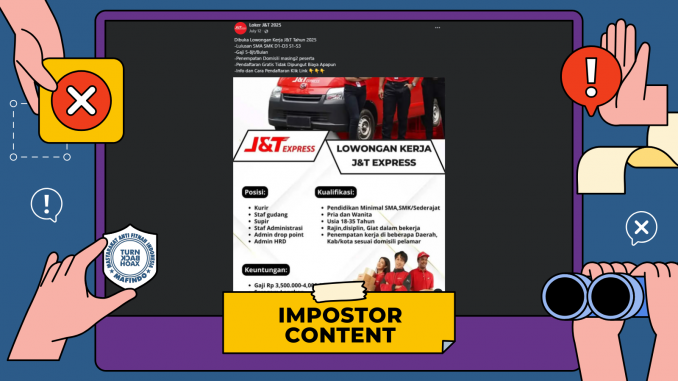 Pada Sabtu (12/7/2025) akun Facebook “Loker J&T 2025” membagikan tautan disertai narasi :“Dibuka Lowongan Kerja J&T Tahun 2025-Lulusan SMA SMK D1-D3 S1-S3 -Gaji 5-8jt/Bulan-Penempatan Domisili masing2 peserta -Pendaftaran Gratis Tidak Dipungut Biaya Apapun-Info dan Cara Pendaftaran Klik Link ????????????Daftar Sekarang Juga”Tim Pemeriksa Fakta Mafindo (TurnBackHoax) mengakses tautan yang dibagikan akun Facebook “Loker J&T 2025”. Diketahui, tautan tidak mengarah ke laman karir J&T Express (jet.co.id/about/career), warganet justru diminta mengisi nama lengkap, alamat, jenis kelamin dan nomor telegram aktif. TurnBackHoax kemudian memasukkan kata kunci “lowongan kerja J&T Express” ke mesin pencarian Google. Hasil pencarian mengarah ke laman karier perusahaan di jet.co.id/about/career.Dari pengamatan TurnBackHoax, informasi resmi terkait lowongan kerja atau rekrutmen yang ada di laman resmi itu tidak menuliskan nominal gaji, berbeda dengan unggahan akun Facebook “Loker J&T 2025”. Adapun rekrutmen J&T Express tidak melalui tautan tertentu. Pelamar yang ingin mendaftar dapat mengirimkan CV melalui email ke gje.recruitment@jet.co.id dengan subjek: GJE–Posisi yang dilamar–Domisi saat ini.