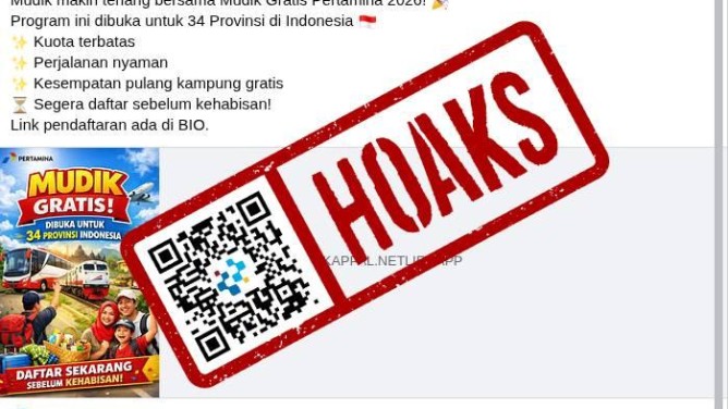 Beredar unggahan di Facebook unggahan beserta narasi “Mudik makin tenang bersama Mudik Gratis Pertamina 2026. Program ini dibuka untuk 34 Provinsi di Indonesia Kuota terbatas, Perjalanan nyaman, Kesempatan pulang kampung gratis, Segera daftar sebelum kehabisan!. Link pendaftaran ada di BIO.”Faktanya, setelah dilakukan penelusuran, tautan tersebut tidak mengarah ke laman resmi Pertamina untuk pendaftaran mudik di www.mudikpertamina2026.com. Sebaliknya, tautan tersebut justru mengarahkan ke sebuah laman yang meminta pengunjung untuk mengisi data pribadi. Informasi yang diminta meliputi nama lengkap sesuai KTP, provinsi, dan nomor Telegram aktif. Melalui akun Instagram resmi PT Pertamina (Persero) @pertamina, diinformasikan bahwa pendaftaran program mudik gratis telah dibuka sejak Selasa, 3 Maret 2026 pukul 10.00 WIB melalui situs resmi www.mudikpertamina2026.com. Pertamina menyediakan moda transportasi bus ke lebih 15 kota tujuan mudik masyarakat Indonesia yang hendak merayakan Idulfitri di kampung halaman.