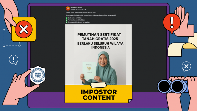 Pada Kamis (16/10/2025) akun Facebook “Informasi terkini” membagikan tautan disertai narasi :“PEMUTIHAN SERTIFIKAT TANAH GRATIS 2025BERLAKU SELURUH WILAYA INDONESIA1. GRATIS PAJAK TANAH (PBB)2. GRATIS BALIK NAMA SERTIFIKAT3. GRATIS PEMBUATAN SERTIFIKAT”Tim Pemeriksa Fakta Mafindo (TurnBackHoax) mengakses tautan yang dibagikan akun Facebook “Informasi terkini”. Diketahui, tautan tidak mengarah ke laman resmi Kementerian ATR/BPN (atrbpn.go.id). Warganet justru diminta mengisi nama lengkap, provinsi dan nomor telegram aktif.TurnBackHoax kemudian menelusuri kebenaran informasi dengan memasukkan kata kunci “pemutihan sertifikat tanah gratis 2025” ke mesin pencari Google. Penelusuran mengarah ke unggahan akun Instagram resmi Kementerian ATR/BPN ‘kementerian.atrbpn’ pada Jumat (17/10/2025).Dalam video tersebut dijelaskan bahwa informasi mengenai program pemutihan sertifikat tanah gratis, balik nama sertifikat gratis, pemecahan sertifikat gratis, pembuatan sertifikat gratis secara penuh, hingga pembebasan pajak tanah adalah tidak benar dan tidak bersumber dari Kementerian ATR/BPN.