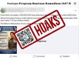 Beredar sebuah unggahan di media sosial Facebook berisi tautan yang diklaim merupakan tautan pendaftaran THR ASN 2026 dari pemerintah bagi para Aparatur Sipil Negara (ASN) 2026 yang dibayarkan dengan total anggaran sekitar Rp55 triliun.Faktanya, klaim adanya tautan untuk mendaftar THR ASN 2026 adalah hoaks. Dilansir dari tirto.id, tautan tersebut mengarah ke laman tidak resmi yang meminta data pribadi seperti nama lengkap sesuai KTP, usia, jenis kelamin, dan nomor Telegram aktif. Pencairan THR ASN 2026 dilakukan secara langsung ke rekening penerima (transfer) melalui mekanisme Surat Perintah Membayar Langsung (SPM-LS) atau melalui instansi dan perusahaan terkait tanpa harus mendaftar melalui tautan.