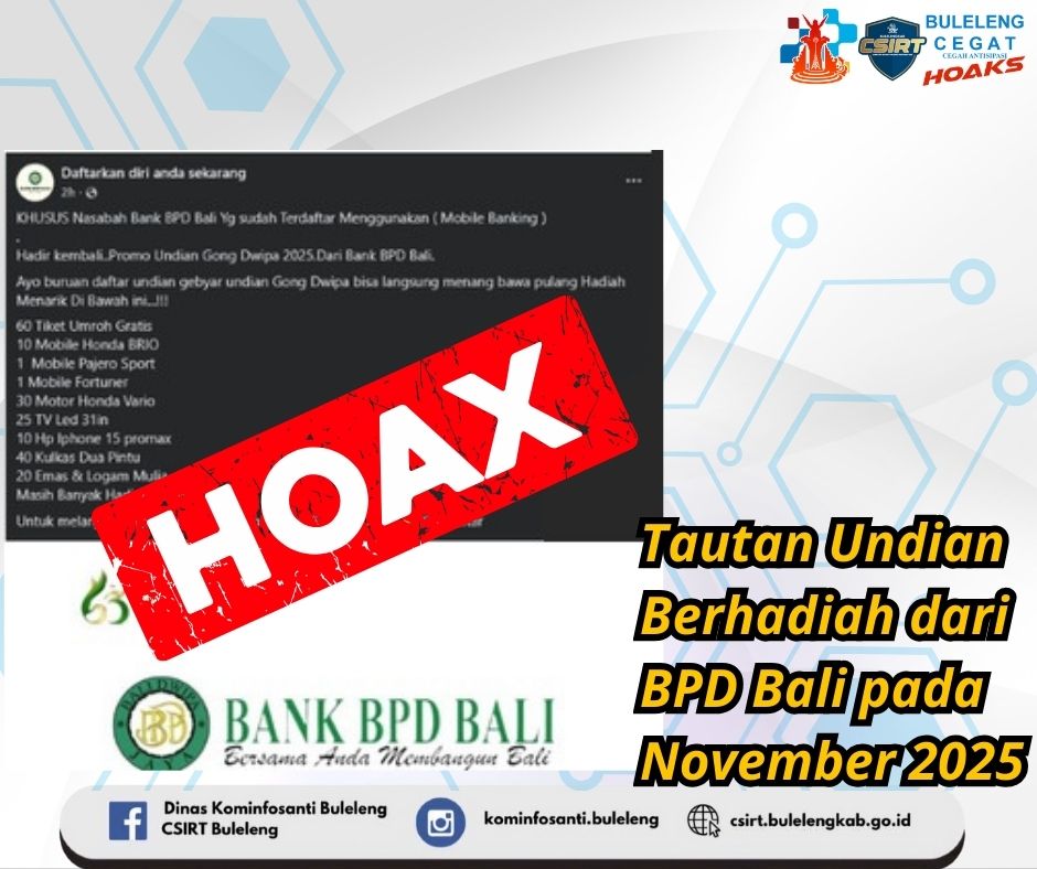 Beredar sebuah unggahan di media sosial Facebook yang mengeklaim bahwa adanya undian berhadiah dari Bank Pembangunan Daerah (BPD) Bali pada November 2025 berupa tiket umroh, mobil, barang-barang elektronik dan lainnya.Faktanya, klaim tersebut adalah tidak benar. Dilansir dari kompas.com, tautan undian berhadiah yang disebarkan oleh akun Facebook tersebut mengarah ke situs phishing atau pencurian data pribadi. Tautan tersebut meminta pengunjung memasukkan data pribadi seperti nama lengkap, saldo terakhir di rekening, dan nomor WhatsApp. Dalam laman resmi Bank BPD Bali menghimbau masyarakat atau nasabah untuk selalu waspada dan hati-hati serta tidak mudah tergiur oleh hadiah atau program-program undian berhadiah yang mengatasnamakan Bank BPD Bali.