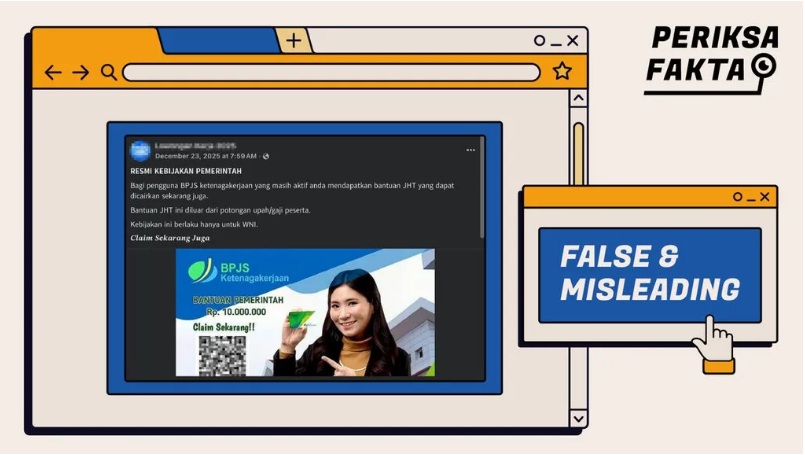 tirto.id - Sebuah unggahan di media sosial Facebook mengklaim adanya kebijakan resmi pemerintah terkait pencairan bantuan Jaminan Hari Tua (JHT) bagi peserta BPJS Ketenagakerjaan yang masih aktif. ADVERTISEMENT Klaim tersebut disebarkan oleh akun Facebook “Lowongan Kerja 2025” (arsip) pada 23 Desember 2025. Dalam unggahannya, pengunggah menyebut bahwa pengguna BPJS Ketenagakerjaan yang masih aktif dapat mencairkan bantuan JHT saat ini juga, tanpa potongan upah atau gaji, serta disebut hanya berlaku bagi Warga Negara Indonesia (WNI). Bagi pengguna BPJS Ketenagakerjaan yang masih aktif Anda mendapatkan bantuan JHT yang dapat dicairkan sekarang juga. Bantuan JHT ini di luar dari potongan upah/gaji peserta. Kebijakan ini berlaku hanya untuk WNI. Klaim sekarang juga,” tulis pengunggah. Unggahan tersebut turut disertai gambar bertuliskan “Bantuan Pemerintah Rp10.000.000, Claim Sekarang!”. Di bagian akhir terdapat tombol yang mengarahkan ke situs pendaftaran lain. Hingga artikel ini ditulis, unggahan tersebut telah memperoleh 21 tanda suka. Lantas, bagaimana kebenaran klaim tersebut? ADVERTISEMENTUntuk mengetahui kebenaran klaim, pertama-tama Tirto membuka tautan yang disertakan di dalam unggahan. Ketika memasuki situs tersebut, Tirto tidak menemukan halaman pendaftaran atau informasi terkait klaim bantuan JHT. Laman tersebut menampilkan pemberitahuan bertuliskan “Akun ini telah ditangguhkan” (This Account has been suspended). Tirto lantas menggunakan situs Who.is untuk menelusuri kredibilitas laman. Hasilnya, tidak ditemukan bahwa laman tersebut berkaitan dengan BPJS Ketenagakerjaan. Laman tersebut diketahui baru dibuat pada 21 September 2025. Selanjutnya, Tirto menelusuri keterangan resmi dari BPJS Ketenagakerjaan untuk memverifikasi klaim tersebut. Melalui akun Instagram resminya @bpjs.ketenagakerjaan, BPJS Ketenagakerjaan mengimbau masyarakat agar tidak mudah tergiur tawaran dari oknum yang mengatasnamakan lembaga tersebut, termasuk klaim bantuan Jaminan Hari Tua (JHT) yang disebarkan melalui tautan tertentu. "Hati-hati terhadap tawaran yang mengatasnamakan BPJS Ketenagakerjaan," begitu bunyi pesan dalam gambar dari unggahan 11 November 2025 tersebut. BPJS Ketenagakerjaan menegaskan bahwa proses klaim JHT dapat dilakukan melalui kanal resmi, yakni layanan Lapak Asik, aplikasi Jamsostek Mobile (JMO), serta kantor cabang BPJS Ketenagakerjaan terdekat.
