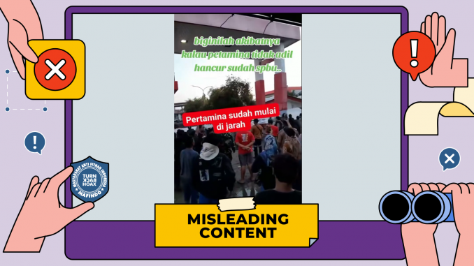 Faktanya, video tersebut merupakan momen unjuk rasa di depan kantor PT Pertamina Patra Niaga TBBM Balongan, Indramayu untuk memprotes pengalihan bantuan susu pada Selasa (23/9/2025).Video berisi klaim “warga menjarah SPBU Pertamina” merupakan konten yang menyesatkan (misleading content).Beredar video [arsip] dari akun Tiktok “paparazi937” pada Minggu (28/9/2025) yang diklaim sejumlah orang menjarah Stasiun Pengisian Bahan Bakar Umum (SPBU) Pertamina. Berikut narasi lengkapnya:begini akibatnya kalau pertamina tidak adil hancur sudah spbu Pertamina sudah mulai di jarahSejak diunggah Minggu (28/9/2025), video itu telah ditonton 756 kali, disukai 56 kali, dan menuai 5 komentar per Senin (6/10/2025).Pemeriksaan Fakta, Disadur dari artikel Cek Fakta kompas.com.Cek Fakta kompas.com menelusuri kebenaran klaim dengan menggunakan metode reverse image search. Hasilnya ditemukan beberapa video serupa yang diambil dari sudut berbeda dari akun Tiktok “akdi.supriatno” dan “tunasfakta“. Dalam keterangannya dijelaskan bahwa video tersebut merupakan momen ketika warga melaksanakan aksi protes di depan kantor Pertamina Balongan, Indramayu, Jawa Barat pada Selasa (23/9/2025).Diberitakan kompas.com sebelumnya, sejumlah warga yang tergabung dalam Forum Masyarakat Balongan Bersatu melakukan aksi unjuk rasa di depan kantor PT Pertamina Patra Niaga TBBM Balongan untuk memprotes pengalihan bantuan susu. Adapun bantuan susu itu dialihkan untuk program Corporate Social Responsibility (CSR) lainnya. Salah satunya yakni penyediaan fasilitas umum berupa gedung serbaguna Desa Balongan. Ketika dikonfirmasi, Pj Corporate Secretary Pertamina Patra Niaga, Roberth MV Dumatubun juga membantah video yang diklaim menampilkan penjarahan di SPBU Pertamina. Roberth menjelaskan, video itu merupakan unjuk rasa menuntut bantuan susu.