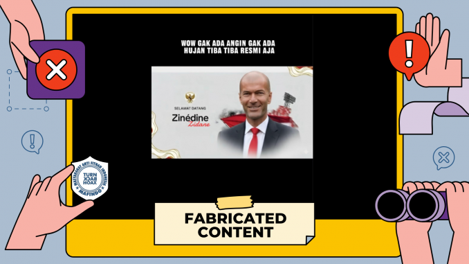 Tidak terdapat informasi kredibel yang membenarkan klaim, hingga Senin (20/10/2025) belum ada pengumuman resmi dari PSSI terkait pelatih tim nasional Indonesia yang baru.Unggahan berisi klaim “Zinedine Zidane jadi pelatih baru timnas Indonesia” merupakan konten palsu (fabricated content).Beredar video [arsip] dari akun tiktok “ze13146” pada Minggu (19/10/2025) yang menampilkan gambar Zinedine Zidane disertai takarir :“Wow Gak ada angin gak ada hujan tiba-tiba resmi ajaSelamat Datang Zinedine Zidan”Hingga Senin (20/10/2025), konten tersebut telah mendapat lebih dari 4 ribu tanda suka, menuai 938 interaksi komentar dan dibagikan ulang sebanyak 170 kali oleh pengguna Tiktok lainnya.Pemeriksaan Fakta, Tim Pemeriksa Fakta Mafindo (TurnBackHoax) menelusuri kebenaran klaim dengan memasukkan kata kunci “Zinedine Zidane jadi pelatih baru timnas Indonesia” ke mesin pencarian Google. Hasilnya tidak ditemukan informasi kredibel yang membenarkan klaim.Tim Pemeriksa Fakta Mafindo (Turnbackhoax) kemudian mencari status terbaru pelatih tim nasional Indonesia di akun instagram resmi milik PSSI. Hasilnya, tidak ditemukan unggahan yang mendukung klaim. Dalam akun tersebut belum ada pengumuman pelatih baru pengganti setelah Patrick Kluivert.Tim Pemeriksa Fakta Mafindo (Turnbackhoax) menelusuri lebih dalam terkait calon pelatih tim nasional Indonesia di Google. Hasilnya ditemukan artikel dari bolasport.com dengan judul “PSSI Belum Bahas Pelatih Baru Timnas Indonesia Pengganti Patrick Kluivert, Termasuk Louis van Gaal”.Dalam artikel yang terbit pada Minggu (19/10/2025) mengutip pernyataan Anggota Exco (Executive Committee) PSSI, Rudi Yulianto yang mengatakan bahwa sampai saat ini belum ada rencana rapat Exco membahas pengganti pelatih timnas, dan ia meminta publik bersabar untuk mendapatkan kabar terbaru tentang pelatih timnas Indonesia.